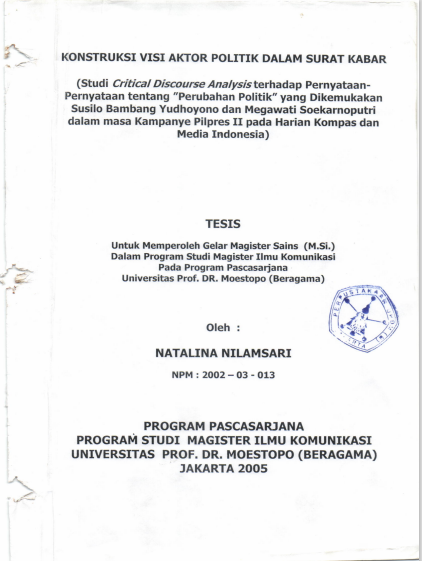 | JUDUL | 2005 | TESIS NATALINA NILAMSARI : KONSTRUKSI VISI AKTOR POLITIK DALAM SURAT KABAR (Studi CriticaI Discourse AnaIysis terhadap pernyataan - Pernyataan tentang "Perubahan Politik" yang Dikemukakan Susilo Bambang Yudhoyono dan Megawati Soekarnoputri dalam masa Kampanye Pilpres II pada Harian Kompas dan Media Indonesia) |