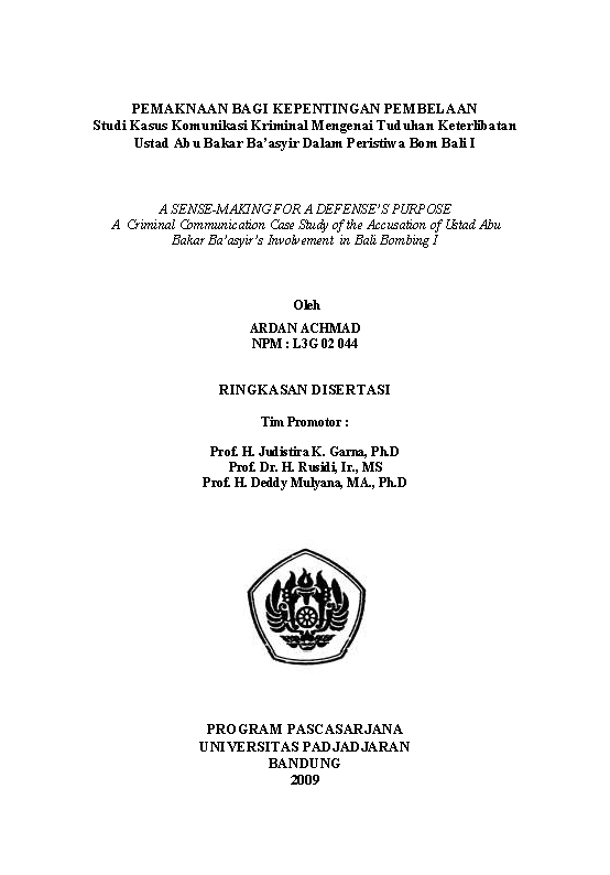 JUDUL 2009 | DISERTASI ARDAN ACHMAD : PEMAKNAAN BAGI KEPENTINGAN PEMBELAAN Studi Kasus Komunikasi Kriminal Mengenai Tuduhan Keterlibatan Ustad Abu Bakar Ba’asyir Dalam Peristiwa Bom Bali I